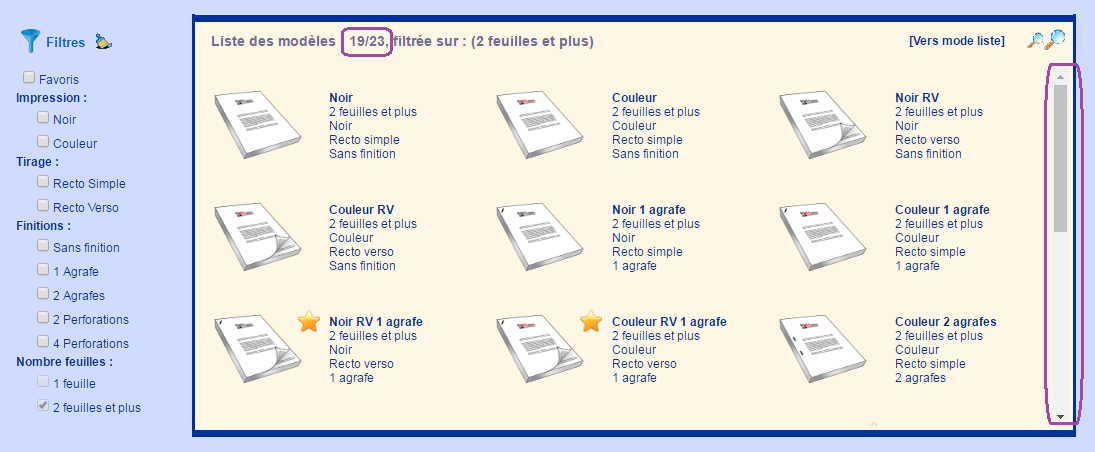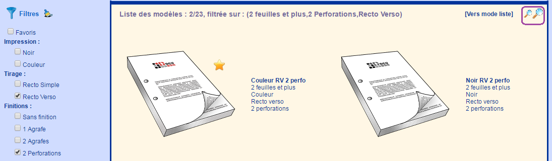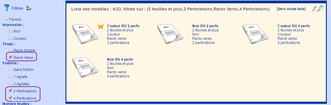 Pour voir uniquement les modèles “Recto Verso” et “Perforations”, cliquer sur les coches correspondantes :