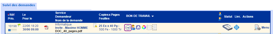 Les demandes de type COPIE se font depuis le lien Bon de Travail puis onglet COPIE.