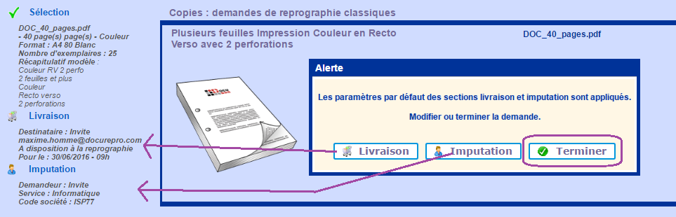 Dans la partie gauche inférieure sont résumées les sections livraison et imputation avec un lien pour en modifier les valeurs.