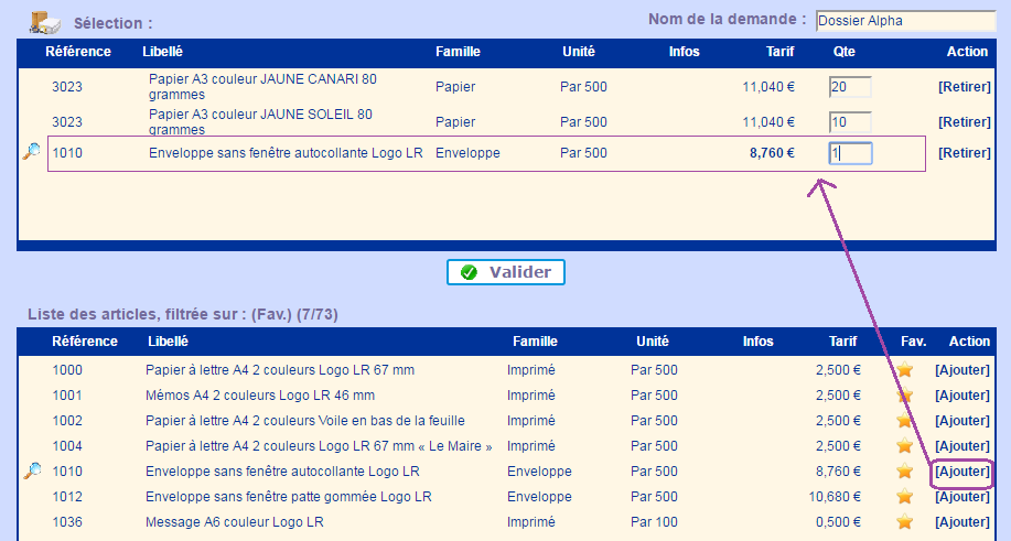 Pour ajouter un article à la liste de la sélection, il suffit de cliquer sur le lien Ajouter de la ligne de l'article souhaité.