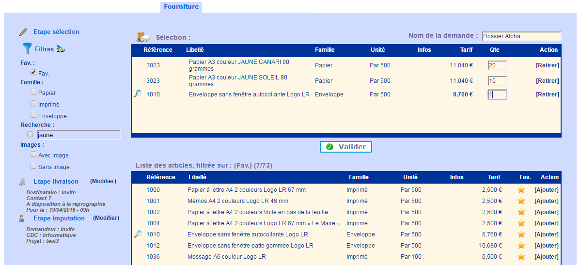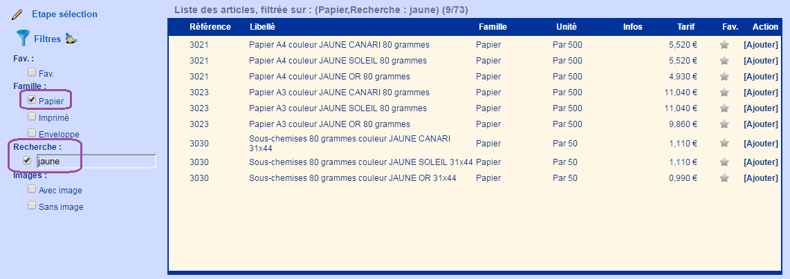 Dans cet exemple les articles affichés le sont sur la famille 'Papier' dont la référence ou le nom contient 'Jaune'