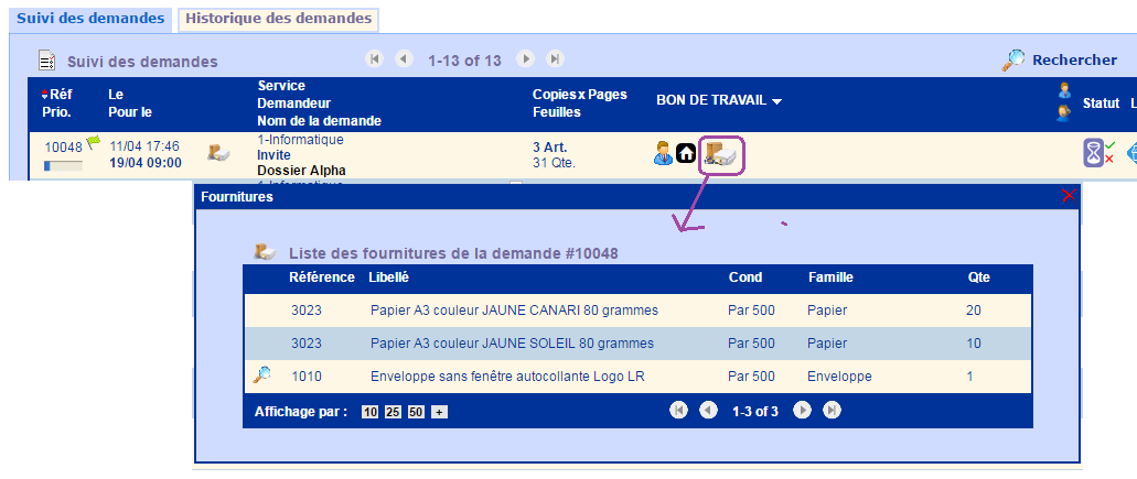 Depuis le suivi des demandes, la liste des articles demandés est affichée en cliquant sur l'icône entouré en violet.